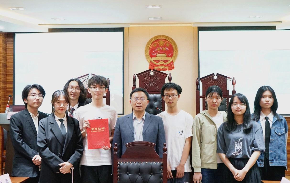 赛事已经接近尾声,杨成良副教授最后统一宣布了经组委会计算出的各参赛团队的平均成绩和获奖情况:孔熠团队荣获一等奖,彭薪霖团队荣获二等奖,陈哲团队、韩蒙恩团队荣获三等奖。胡炀威庭长、吴爱民主任和邓大鸣教授分别为获奖团队颁奖,专家评委们面对获奖同学们的殷切目光,既有赞赏亦有期待。
