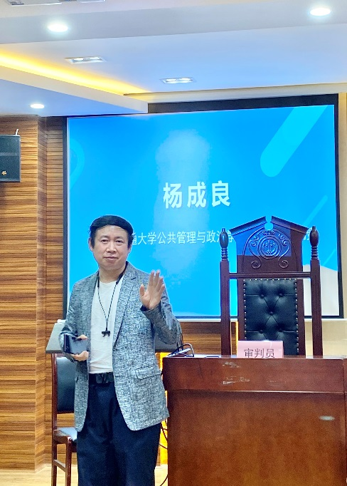 本次竞赛案例的设计人杨成良副教授在最后点明,本次案例系根据一宗经历了一审、二审的真实案例改编设计而成,并将案件中所有的证据材料在改编了当事人基本信息后附上,希望同学们能够学习到在面对当事人陈述的案件事实和庞杂的证据材料时,应该如何研读证据,进而对案件事实进行梳理,再进一步思考如何适用法律。同学们把在课堂上所学的法学理论、实体法与程序法在一场模拟庭审中进行系统运用,这才是一场模拟庭审的精要所在。杨老师结合着精心制作的PPT文件,对案例中所涉的相关法律要点进行了生动而全面专业剖析,在场的同学们犹如聆听了一场民事诉讼法学学术讲座,颇有感触,受益匪浅。